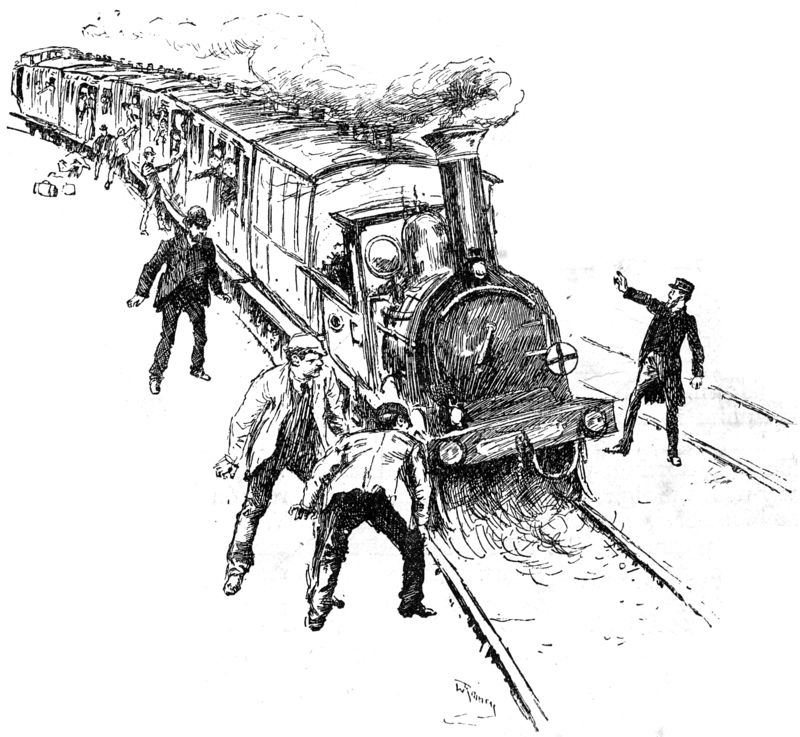 Hark! what was that? He listened and thrilled. Oh no, too terrible. Yes, yes, it must be—the railway, the railway! He knew it. He felt it. Along the up line, on which Netta was lying, he heard behind him—oh, unmistakable, unthinkable, the fierce whirr of the express dashing madly down upon him. Great heavens, what could he do? The train was coming, the train was almost this moment upon them. Before he could have time to rush wildly forward and snatch Netta from where she lay, full in its path, a helpless weight, it would have swept past him resistlessly, and borne down upon her like lightning.