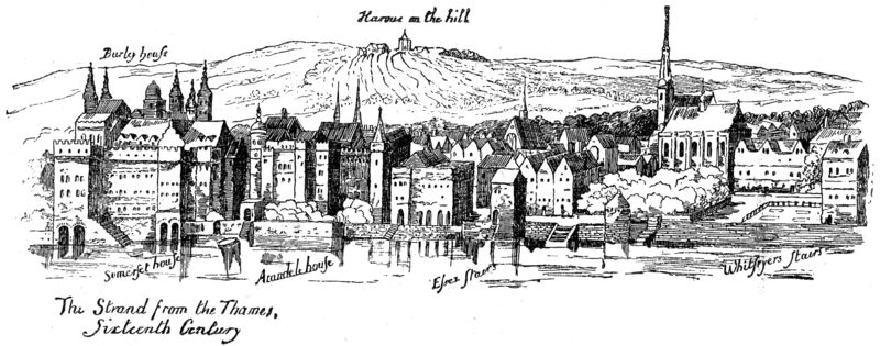 Then arose fair mansions, chiefly upon the southern side, giving upon the river, for the sake of the airy gardens, as well as of easy access to the stream which remained London's great and easy highway until long after the Strand had been paved and rendered practicable for wheels. It was upon the water, then, that the real pageant of London life—a fine and well-coloured pageant it must often have been—was to be seen. By water it was that[Pg 5] the people of the great houses went to their plots, their wooings, their gallant intrigues, to Court, or to Parliament. Also it was by water that not infrequently they went, by way of Traitor's Gate, to Tower Hill, or at least to dungeons which were only saved from being eternal by policy or expediency. This long Strand of palaces became the theatre of a vast volume of history which marked the rise and extension of some of the grandest houses that had been founded in feudalism, or have been built upon its ruins. Some of the families which lived there in power and pomp are mere memories now; but the names of many of them are still familiar in Belgravia as once they were in the Strand. There was, to start with, the original Somerset House, more picturesque, let us hope, than the depressing mausoleum which now daily reminds us that man is mortal. Then there was the famous York House, nearer to Charing Cross, of which nothing but the water-gate is left. On the opposite side of the way was Burleigh House, the home of the great statesman who, under God and Queen Elizabeth, did such great things for England. Burleigh is one of the earliest recorded cases of a man being killed by over-work. "Ease and pleasure," he sighed, while yet he was under fifty, "quake to hear of death; but my life, full of cares and miseries, desireth to be dissolved." The site of Burleigh House is kept in memory, as those of so many other of the vanished palaces of the Strand, by a street named after it; and the office of this magazine stands no doubt upon a part of Lord Burleigh's old garden. When Southampton House, Essex House, the Palace of the Savoy, and Northumberland House, which disappeared so lately, are added, we have still mentioned but a few of the more famous of the Strand houses.