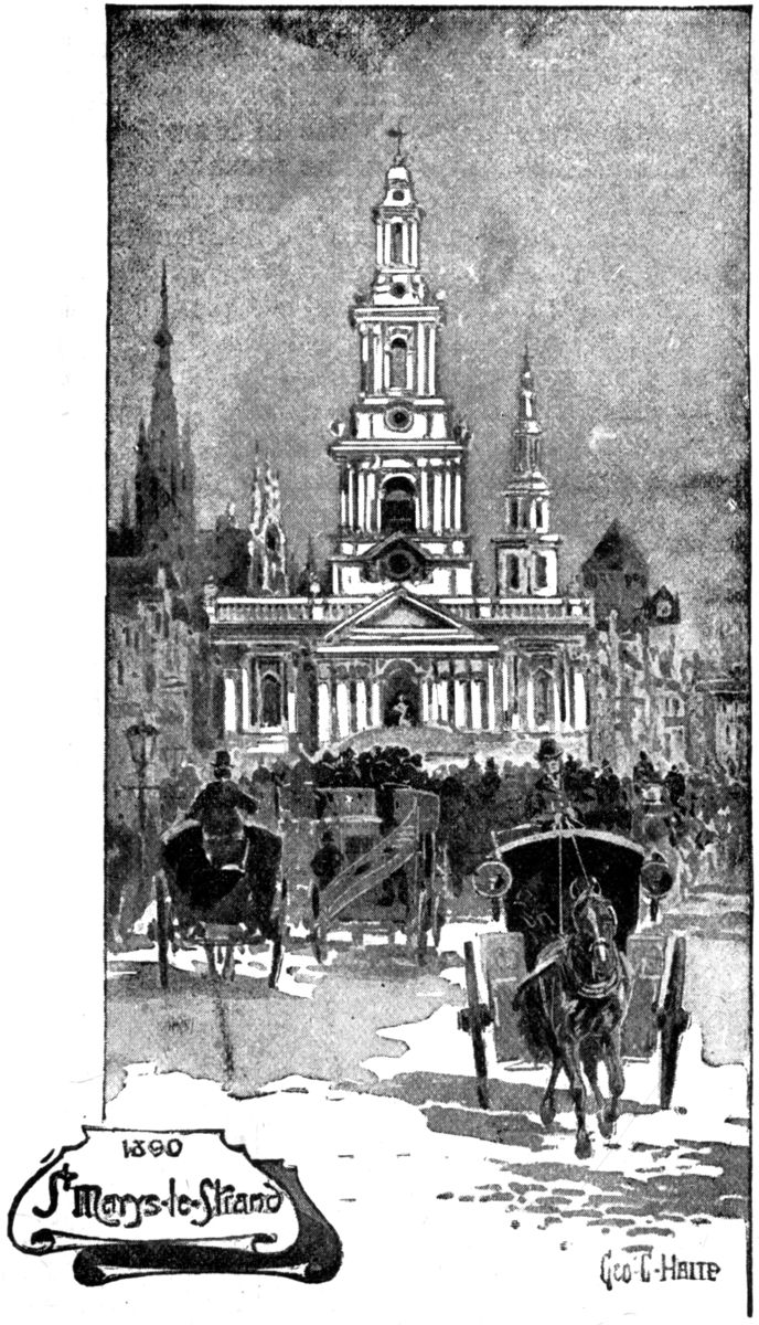 Nearly opposite Essex-street stands one of the most famous of London landmarks—the church of St. Clement Danes. Built as recently as 1682, it is the successor of a far older building. Its most interesting association is with Dr. Johnson, whose pew in the north gallery is still reverently kept, and an inscription marks the spot. In this church it was that Miss Davies, the heiress, who brought the potentiality of untold wealth into the family of the Grosvenors, was married to the progenitor of the present Duke of Westminster. St. Clement Danes is one of the few English churches with a carillon, which is of course set to psalm tunes. Milford-lane, opposite, was once really a lane with a bridge over a little stream which emptied into the Thames. Later on it marked the boundary of Arundel House, the home of the Dukes of Norfolk, who have built Arundel, Norfolk, Howard, and Surrey streets upon its site. In the time of Edward VI. the Earl of Arundel bought the property for forty pounds, which would seem to have been a good bargain even for those days. In Arundel House died "old Parr," who, according to the inscription upon his tomb in Westminster Abbey, lived to be 152 years old. Happily for himself he had lived all his life in Shropshire, and the brief space that he spent in London killed him.