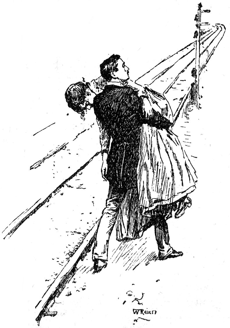 Hark! what was that? He listened and thrilled. Oh no, too terrible. Yes, yes, it must be—the railway, the railway! He knew it. He felt it. Along the up line, on which Netta was lying, he heard behind him—oh, unmistakable, unthinkable, the fierce whirr of the express dashing madly down upon him. Great heavens, what could he do? The train was coming, the train was almost this moment upon them. Before he could have time to rush wildly forward and snatch Netta from where she lay, full in its path, a helpless weight, it would have swept past him resistlessly, and borne down upon her like lightning.