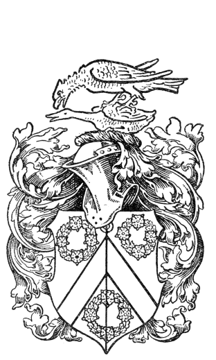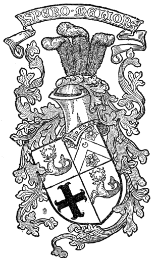 [19] Upon a wreath of the colours, from a plume of five ostrich feathers or, gules, azure, vert, and argent, a falcon rising of the last; with the motto, "Malo mori quam fœdari."