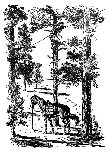 Sanchez and Delgadito felled one of these trees with copper hatchets, cut off two stout chunks, and tied either end of a long rawhide thong to them. Then they stretched the thong as far as it would reach, and buried the chunks in the earth, at the bottom of the creek bed. Careful to place a gentle horse between two quick-tempered mounts, they tied all animals to this picket line. This done, all got their weapons and started up over the wash.
