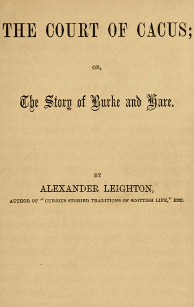 [18] “After this exhibition,” says an eye-witness, “Burke was cut up and put in pickle for the lecture-table. He was cut up in quarters, or rather portions, and salted, and, with a strange aptness of poetical justice, put into barrels. At that time an early acquaintance and school-fellow was assistant to the professor, and with him I frequently visited the dissecting-room, when calling on him at his apartments at the College. He is now a physician in the Carse of Gowrie. He shewed me Burke’s remains, and gave me the skin of his neck and of the right arm. These I had tanned—the neck brown, and the arm white. The white was as pure as white kid, but as thick as white sheepskin; and the brown was like brown tanned sheepskin. It was curious that the mark of the rope remained on the leather after being tanned. Of that neck-leather I had a tobacco-doss made; and on the white leather of the right arm I got Johnston to print the portraits of Burke and his wife, and Hare, which I gave to the noted antiquarian and collector of curiosities, Mr Fraser, jeweller, and it was in one of his cases for many years—may be still, if he is alive.”