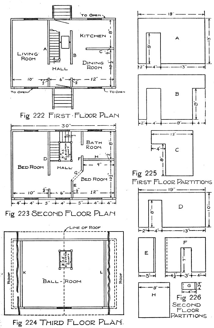 | The Building Material—The Floor Plans—The Partitions—The Elevator-shaft—The Side Walls—The Rear Wall—The Front Wall—The Windows—The Roof—The Chimney—An Elevator—The Car—The Guide-wires—The Pulleys—The Chain Cable—The Counter-balance—The Gable-ends—Spring-catches—The Stairway—Stringers—Treads and Risers—Newel-posts—Hand-rails—Balusters—The Front Steps—The Window Openings—The Window Glass—The Front and Rear Doors—The Outside Trimmings—The Interior Woodwork—Setting the Nail-heads—Painting. |