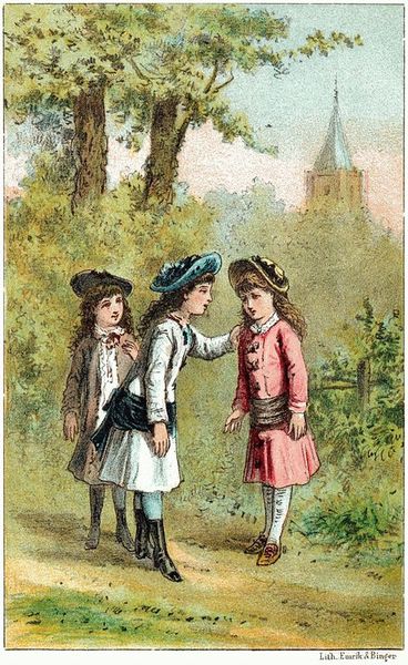 Jansje zat intusschen op school en dacht aan niets minder dan aan haar ring. ’t Scheen vandaag nog al goed met haar en haar lessen te zijn afgeloopen, ten minste haar naam stond niet op de lijst van strafwerk, ’t geen bijna onder de bijzonderheden mocht gerekend worden. Hoe zou ze ook om haar ring denken; — ze had wel wat anders in haar hoofd. Met Cato, een harer[16] schoolvriendinnetjes, had ze afspraak gemaakt om dadelijk na den eten met haar naar een naburig dorp te gaan, waar een tante van haar (Cato) woonde, die een fermen kersenboomgaard had. Cato moest een boodschap voor haar moeder doen en had Jansje, die ze graag mocht lijden, gevraagd om haar te vergezellen.