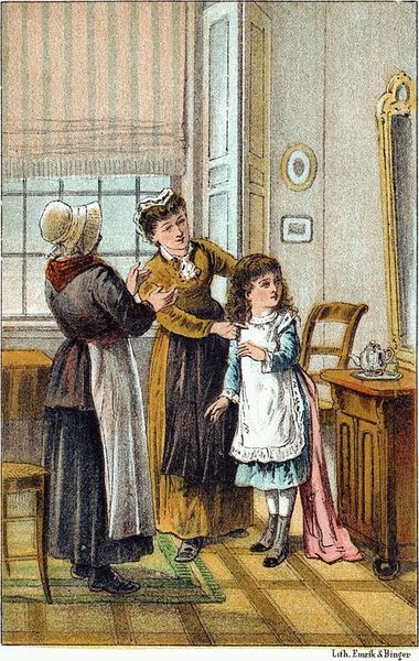 „Wel zeker, als je er maar knap uitziet, wanneer je bij vreemde menschen komt. Maar zeg eens, waarom heb je vandaag je bruine jurk aangedaan en niet je paarsche van gisteren?”