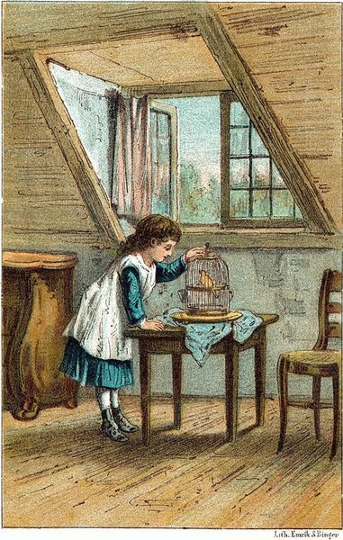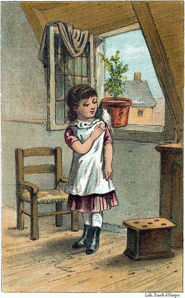 „Arme bloemen!” zei ze. „’t Is waarlijk zonde en jammer, dat je hier staat te verkwijnen door gebrek aan goede oppassing. Dat moest bloemen voor haar venster hebben! Had ze ze liever in den tuin laten staan;[13] dan hadden ze ten minste gelegenheid om te bloeien!”