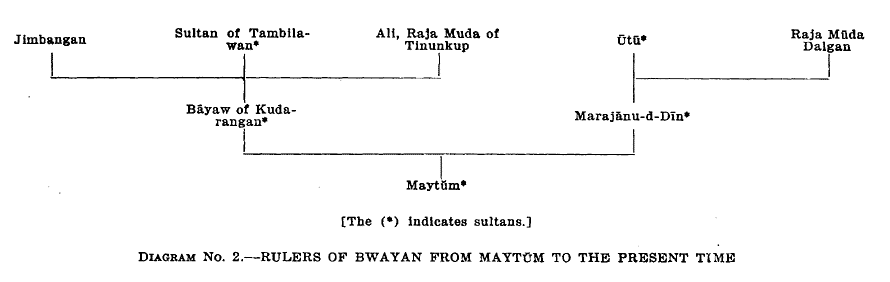 Diagram No. 1 ends with Sultan Sakandar. The relation between him and Sultan Maytŭm, the next raja of Bwayan, is not given in the records. The second diagram begins with Sultan Maytŭm and ends with the present generation of rulers. [22]