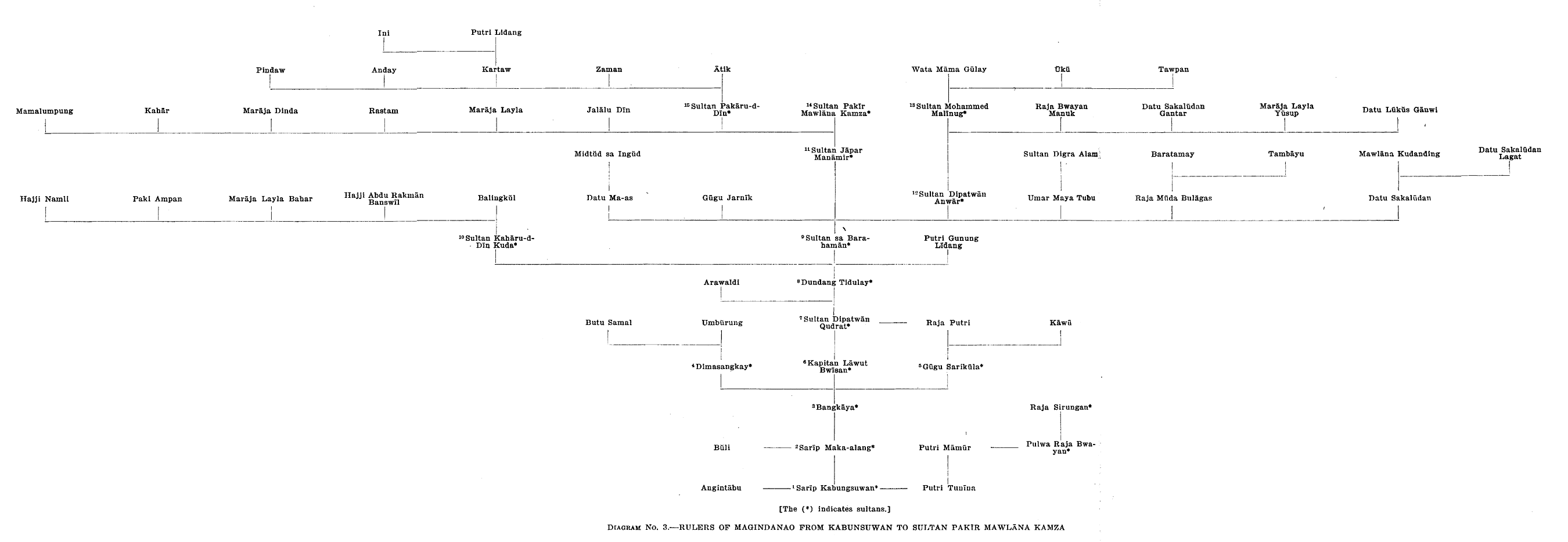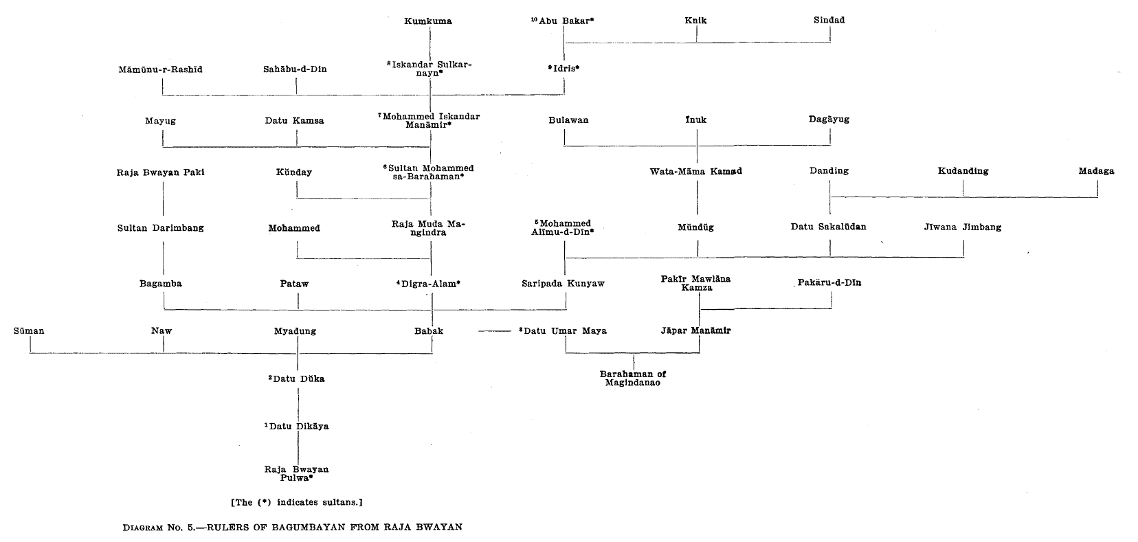 Diagrams Nos. 1 and 2 show plainly that the sultanate of Bwayan did not follow any direct line of succession, that the rajas of Bwayan did not always stay at Bwayan, and that Bwayan was not the only capital of the sultanate. The datus and the sultans of the neighboring datuships who married the principal princesses of Bwayan seem to have assumed the title of Raja Bwayan also.