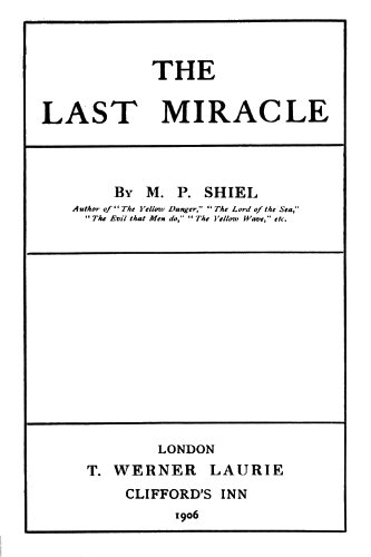 The Project Gutenberg EBook of The Last Miracle, by M. P. Shiel This eBook is for the use of anyone anywhere at no cost and with almost no restrictions whatsoever. You may copy it, give it away or re-use it under the terms of the Project Gutenberg License included with this eBook or online at www.gutenberg.org Title: The Last Miracle Author: M. P. Shiel Release Date: January 6, 2013 [EBook #41794] Language: English Character set encoding: ISO-8859-1 *** START OF THIS PROJECT GUTENBERG EBOOK THE LAST MIRACLE *** Produced by Greg Bergquist, Mary Meehan and the Online Distributed Proofreading Team at http://www.pgdp.net (This file was produced from images generously made available by The Internet Archive)