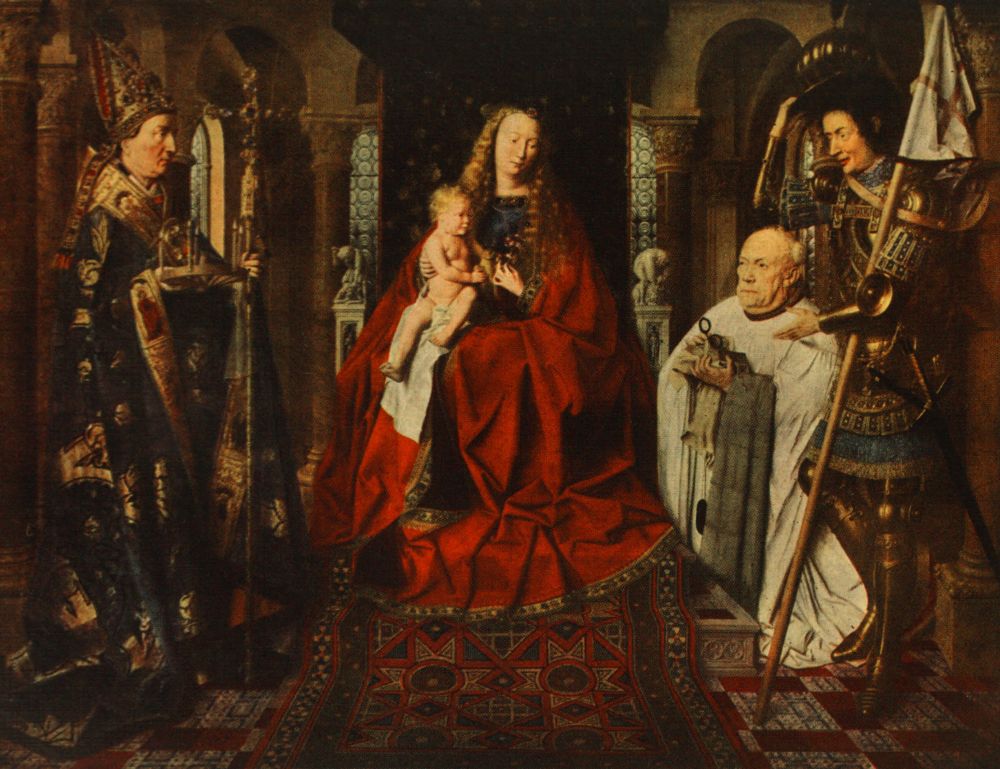 The largest but one of the Painter's works, unfortunately damaged by cleaning and clumsy retouching, while the general effect is marred by a thick coating of cloudy varnish. The white shame-cloth about the Child's loins is a later addition. At the foot on the original frame we read: "Hoc opus fecit fieri magister Georgius de Pala huius ecclesie canonicus per Iohannem de Eyck pictorem: ... completum anno 1436°." In the Town Gallery, Bruges. See page 74.