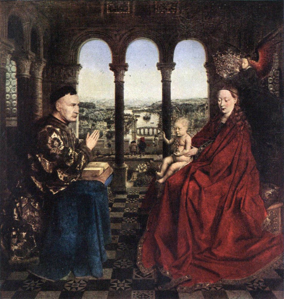 Whether the work of Hubert or of John is still in dispute: hence an interesting example for the critical student of their respective arts. Nicholas Rolin was born in 1376, was created Chancellor of Burgundy and Brabant on December 3, 1422, and died January 18, 1462. The landscape in the background is distinctly reminiscent of the scenery about Maastricht, the alma mater of the Van Eycks. The general effect of the picture is marred by an unpleasant coating of yellow varnish. Date uncertain. In the Louvre, Paris. See page 78.