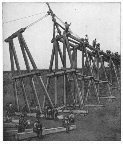 It was late afternoon. The chief was sitting in his room, before a table which was piled high with maps, blue-prints, invoices, and letters. All day long he had been sitting at this table, going over the details of the work in hand. Old Vandervelt had reported that the rails and[Pg 6] bolts and ties and other necessaries were on the cars; Flint and Scribner had reported for their divisions; the statements of the various railroad officials had been examined, to make sure that no details were overlooked, for these would, sooner or later, bob up in the form of misunderstandings; the thousand and one things which must be considered before the expedition should take the plunge into the desert had apparently been disposed of. And finally, when the large clock down in the office was announcing, with a preliminary rattle and click, that it intended very shortly to strike the half-hour between five and six, the chief pushed back his chair and looked up at his engineers, who were seated about him—Old Van before him on a trunk; Scribner and Young Van beside him on the bed; John Flint, a thin, sallow man, astride the other chair, and Haddon on the floor with his back against the wall.