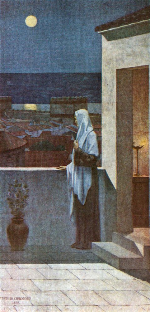 This composition, so great in its simplicity and so beautiful in execution, is the last work of the great artist. The model who posed for the saint watching over the city was Puvis de Chavannes' own wife. Both he and she died very shortly after its completion.