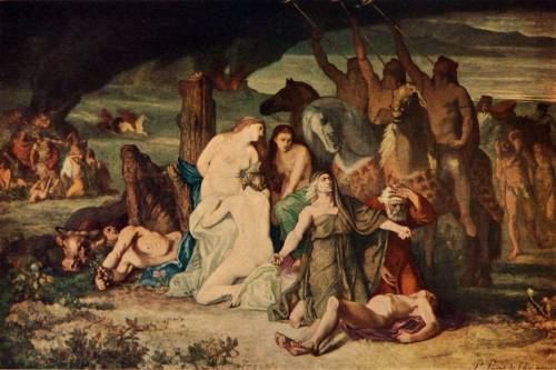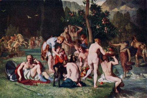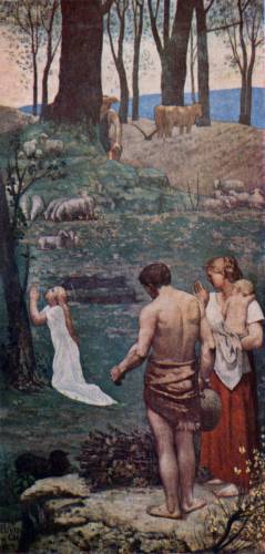 Young Puvis de Chavannes was sent, first to the Lycée at Lyons, later to the Lycée Henri IV, at Paris. But nothing either in the boy's tastes or in his aptitudes gave any hint of his future vocation; he showed no special inclination for drawing, nor even for art in general. Son of a mining engineer, he applied himself naturally to the exact sciences; and he would probably have donned the uniform of a polytechnic student, had it not been for an illness which the family looked upon as most unfortunate, but which posterity regards as providential. The young man was forced to interrupt his studies and bid good-bye to mathematics. Two years later he took a trip to Italy, in the company of a young married couple. In true tourist fashion he made the rounds of museums and churches; he conscientiously inspected the great masterpieces in which the peninsula abounds; but, by his own admission, he brought back no real profit from his travels. They were not, however, entirely futile, since they awakened in him the desire to become[18] a painter. Upon returning to France he announced his determination to his family, and having won their consent, entered the studio of Henri Scheffer, brother of Ary Scheffer.