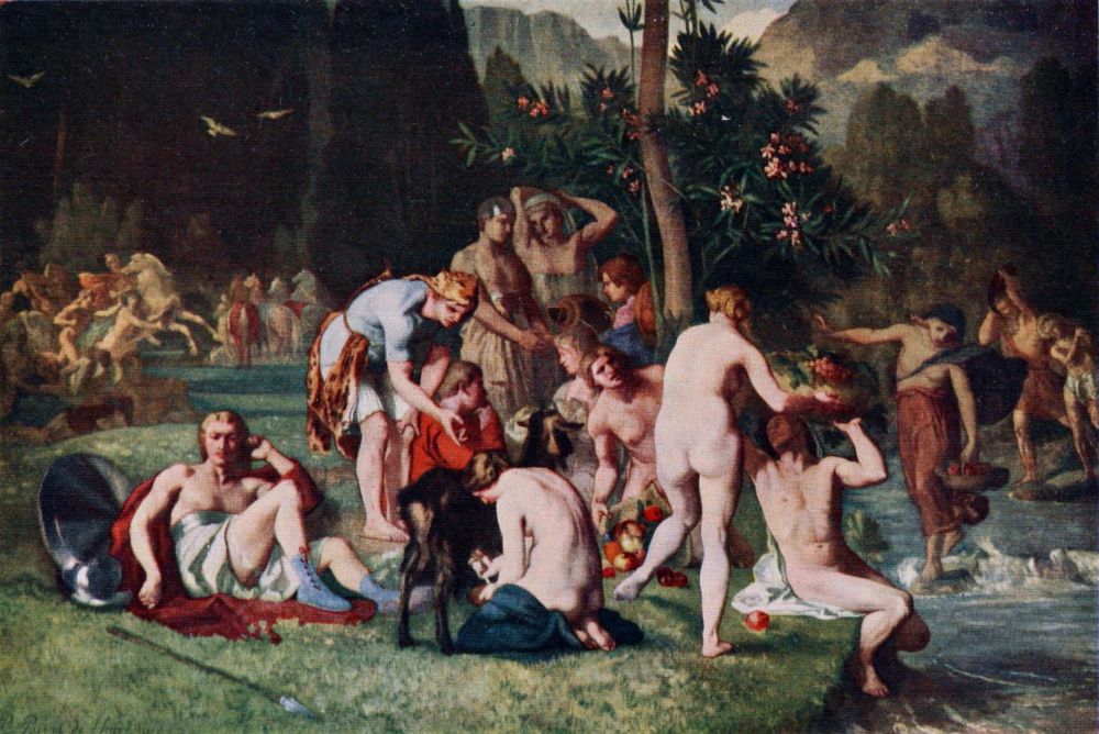 In the first of these pictures, the one consecrated to the pleasures of Peace, everything seems quite academic, the poses, the composition, the countenances: and yet, there is no stiffness, everything is vibrant, alive, palpitating in a serene and luminous atmosphere. The artist has herein magnificently demonstrated the truth of a phrase which he wrote to Ary Renan, in the course of a trip which the latter took to Italy: "Just as you[28] yourself feel and have very well expressed, no study of other artists' work can trammel one's originality." Neither the memory of Italy nor the influence of Couture had prevented him from asserting himself, and that, too, vigorously.