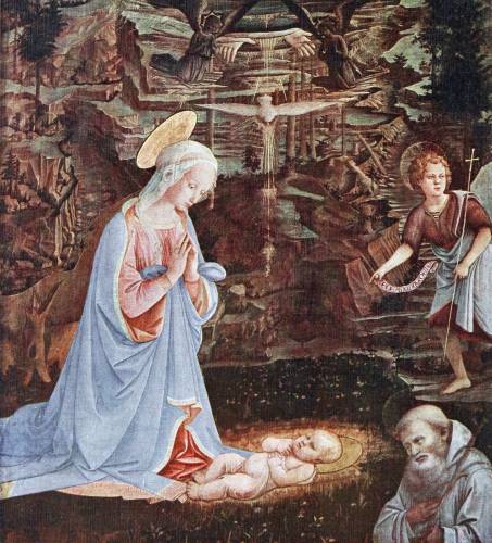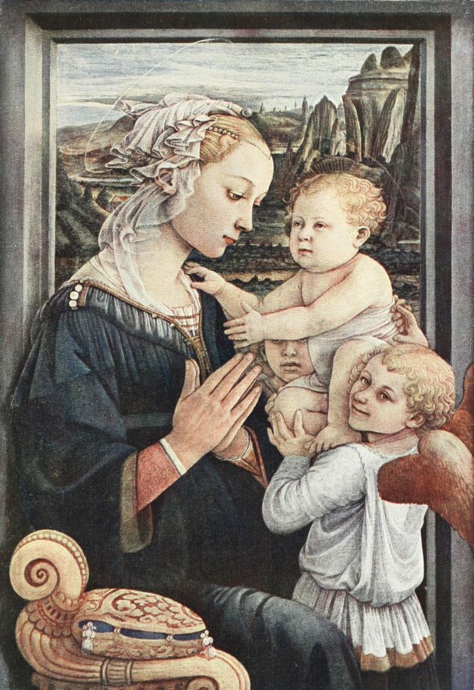 In this earliest known picture by Filippo Lippi, the painter is still entirely under the influence of his youthful training. It is just like an illuminated miniature on a large scale, and is lacking in unity of design or pictorial vision. Note the way in which the figure of the Madonna is detached from the background, without having any real plastic life; and how awkwardly the monk is placed in the corner. The rocky landscape, with its steep perspective, is still quite in the spirit of the early primitives, although certain realistic details, like the cut-down tree-stump behind the Virgin, and the reflection of the sky in the water, show his loving observation of Nature. The picture was for a long time attributed to Masaccio's master, Masolino.