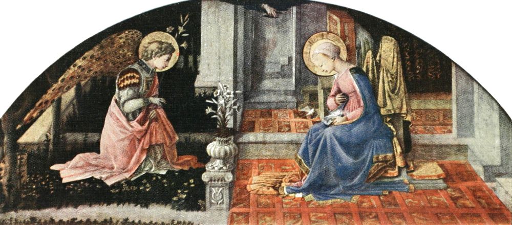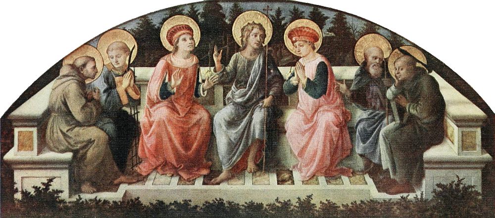 The companion picture to the "Annunciation" lunette is the first rendering in Italian art of a Santa Conversatione in the open air. It is just an assembly of seven saints, without any real inner connection, the two pairs at the sides—SS. Francis and Lawrence on the left, and SS. Anthony and Peter Martyr on the right—being absorbed in their own doings and paying no attention to the blessing which St. John apparently bestows upon SS. Cosmas and Damianus, the patron saints of the Medici family. The little glimpse of a landscape background behind the marble bench affords evidence of Fra Filippo's close study of Nature even at that early period.