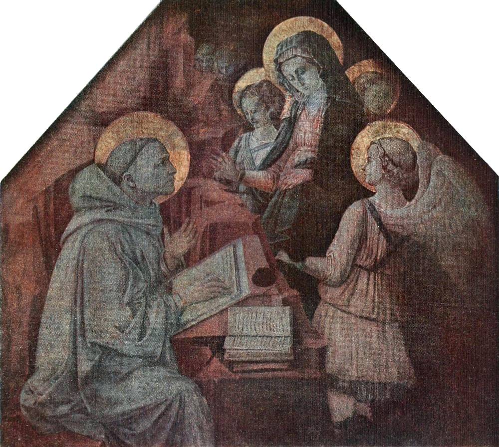 The Vision of St. Bernard, although at present the mere ghost of a picture from which almost every vestige of the original colour has faded away, is an important landmark in Fra Filippo's life, as it is one of the few works about which we have definite dates. It is mentioned by Vasari as being one of two pictures intended to be placed over doors in the Palazzo della Signoria, Florence. A contemporary record states, that on May 16, 1447, Fra Filippo received 40 lire for having painted "the figure of the Virgin and of St. Bernard." The companion picture, which represented the "Annunciation," has disappeared.