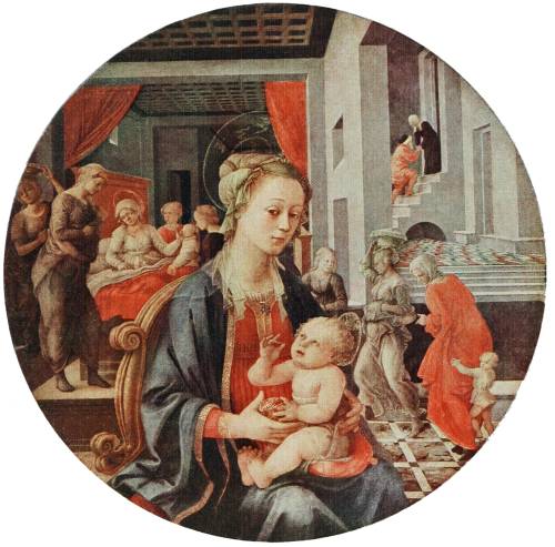 This charming lunette and its companion, "St. John the Baptist and Six Saints," were painted for the decoration of an apartment in the Riccardi Palace, by order of Cosimo de' Medici, whose crest—three feathers in a ring—is introduced in the stucco ornamentation of the balustrade. They were painted about 1438, towards the end of Fra Filippo's first Florentine period, and show far greater richness of colour and better management of light than his earlier known works at the Florence Academy. The perspective is still faulty, and the vase in the centre of the picture is terribly out of drawing. It has been suggested that this picture and the "Seven Saints" were the very panels on which Filippo Lippi was at work when he effected his romantic escape from Cosimo's palace, which is the subject of Browning's well-known poem.