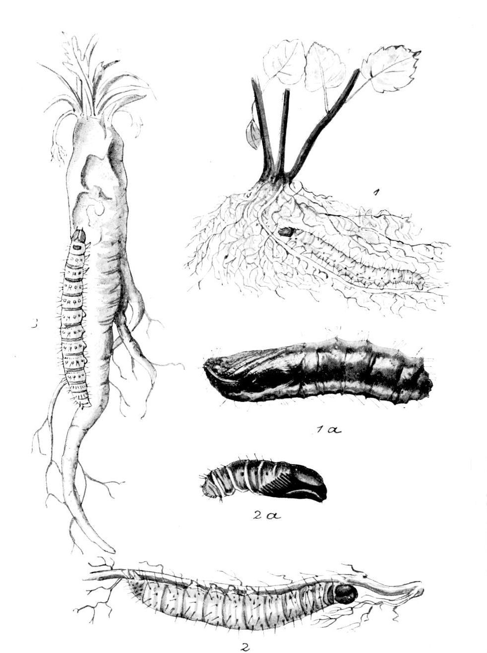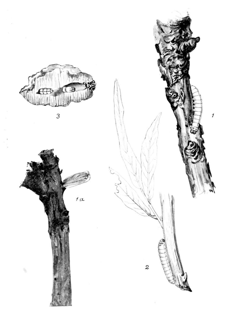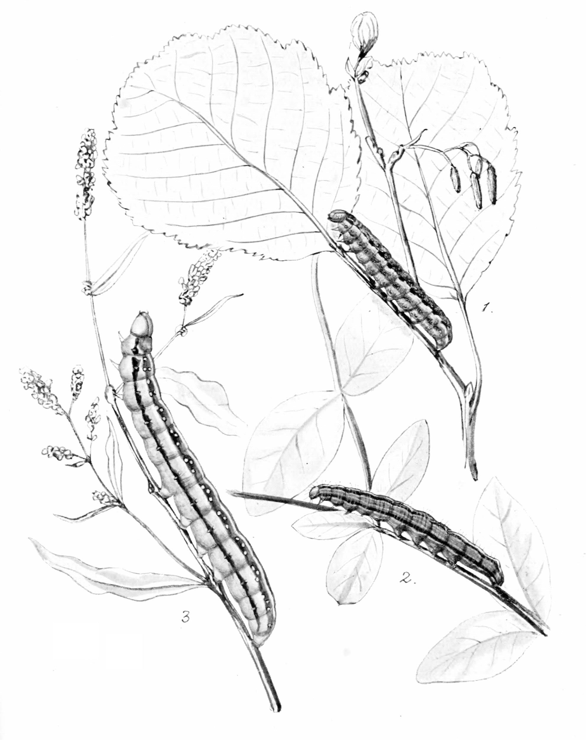 The caterpillar is brown, sometimes inclining to reddish marked with black above, and the under surface is paler; there are three pale lines along the back, and one low down along each side; head, pale brown freckled with darker brown. It feeds in April and May on willows, chiefly the narrow-leaved kind, and also, although less frequently perhaps, on poplar. These caterpillars may often be found in the daytime under loose bark of the willow, or lurking among grass roots or débris around the trunk. (Fig. 1 on Plate 3 is from a coloured drawing by Mr. A. Sich.)