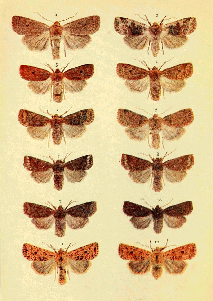 In the general colour of the fore wings, this species, of which four figures will be found on Plate 7, ranges from pale ochreous {12}brown to dark blackish grey. The typical form (lunosa, Haworth) has the ground colour pale, or bright, reddish (Figs. 1 and 3); the markings are well defined, and the wing rays are sometimes pale ochreous, or whitish. Four modifications of this form have been named; one of these has pale veins, but the general colour is red brown (ab. brunnea, Tutt); in another (Fig. 2) the colour is ochreous brown, the veins pale, and the other markings distinct (ab. humilis, Humph. and Westw.). Of the greyish forms, var. agrotoïdes, Guenée, is the darkest (Fig. 4).