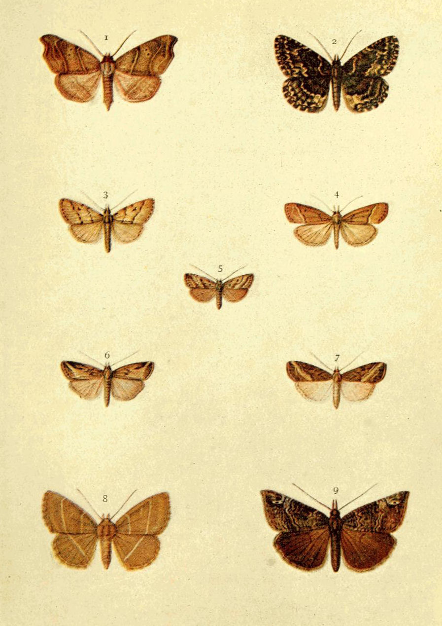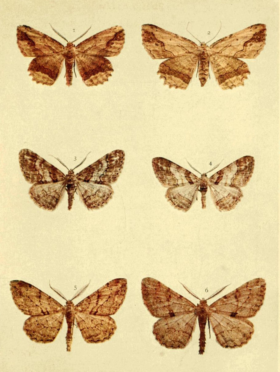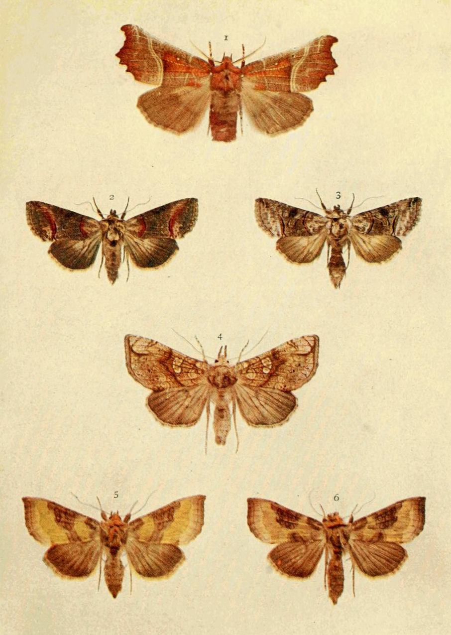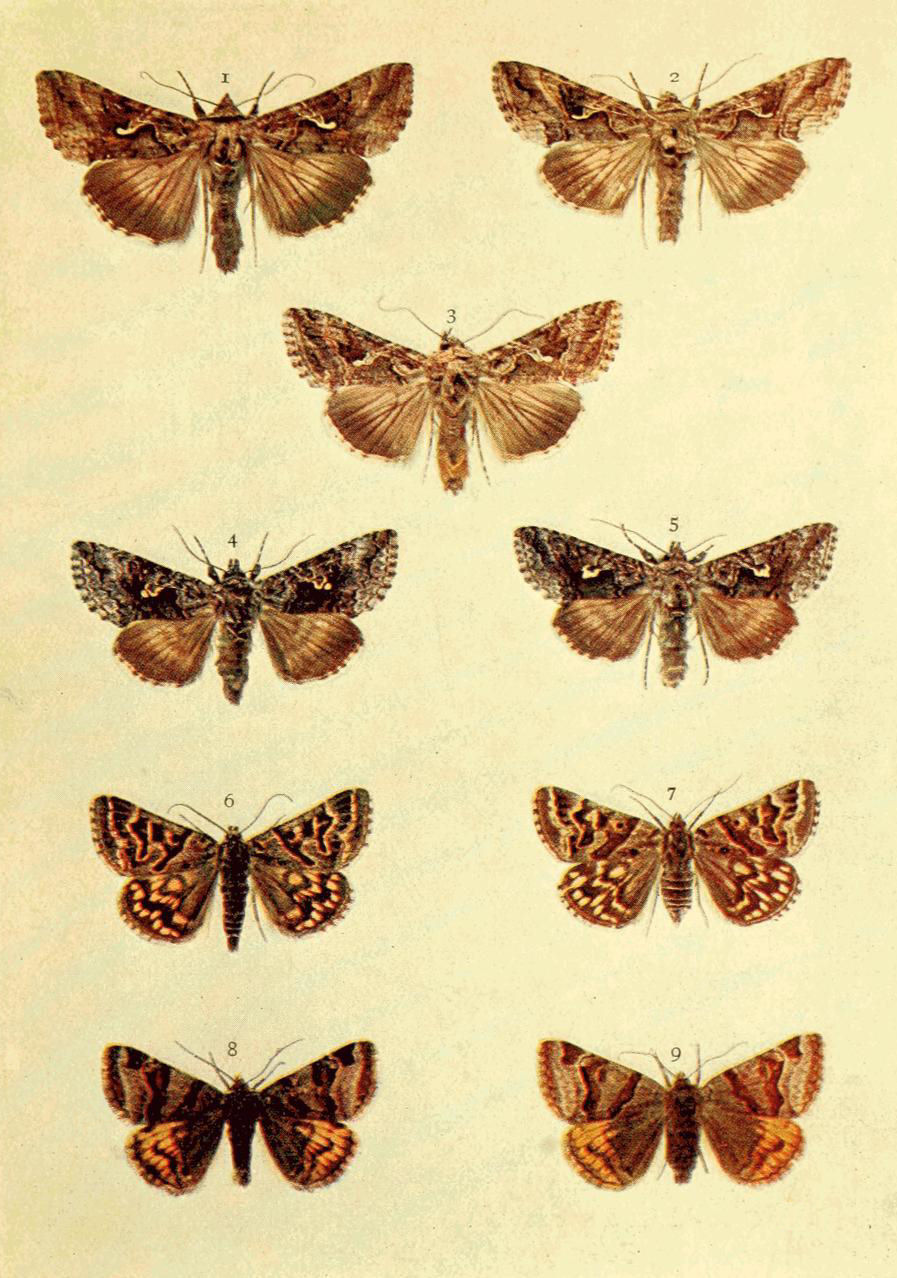 On Plate 9 is shown a male specimen of the typical form (Fig. 1). In ab. ochrea, Tutt, the general colour of the fore wings is ochreous with a greenish tinge, and so it differs from the type, in which the ground colour is reddish. In another ochreous form the cross bands are of a purplish tint (ab. punica, Borkhausen), and in ab. rufina, Hübner, the bands are also purplish, but the ground colour is of a somewhat brighter red than in the type. Ab. unicolor, Tutt, is dull reddish with indistinct cross markings, and seems to be a modification of the almost unicolorous form of a bright red colour, ab. rufa, Tutt. (Fig. 2.)