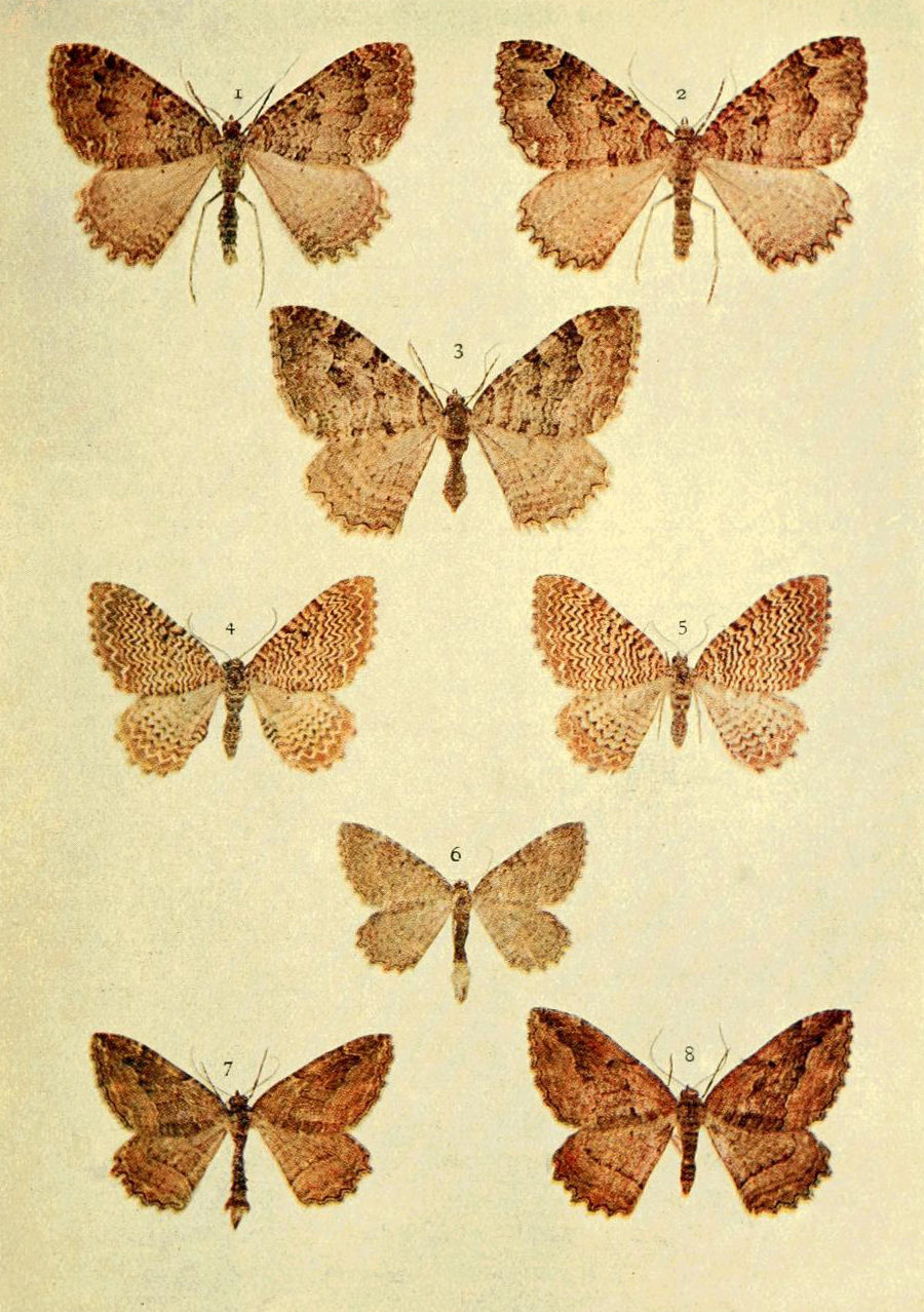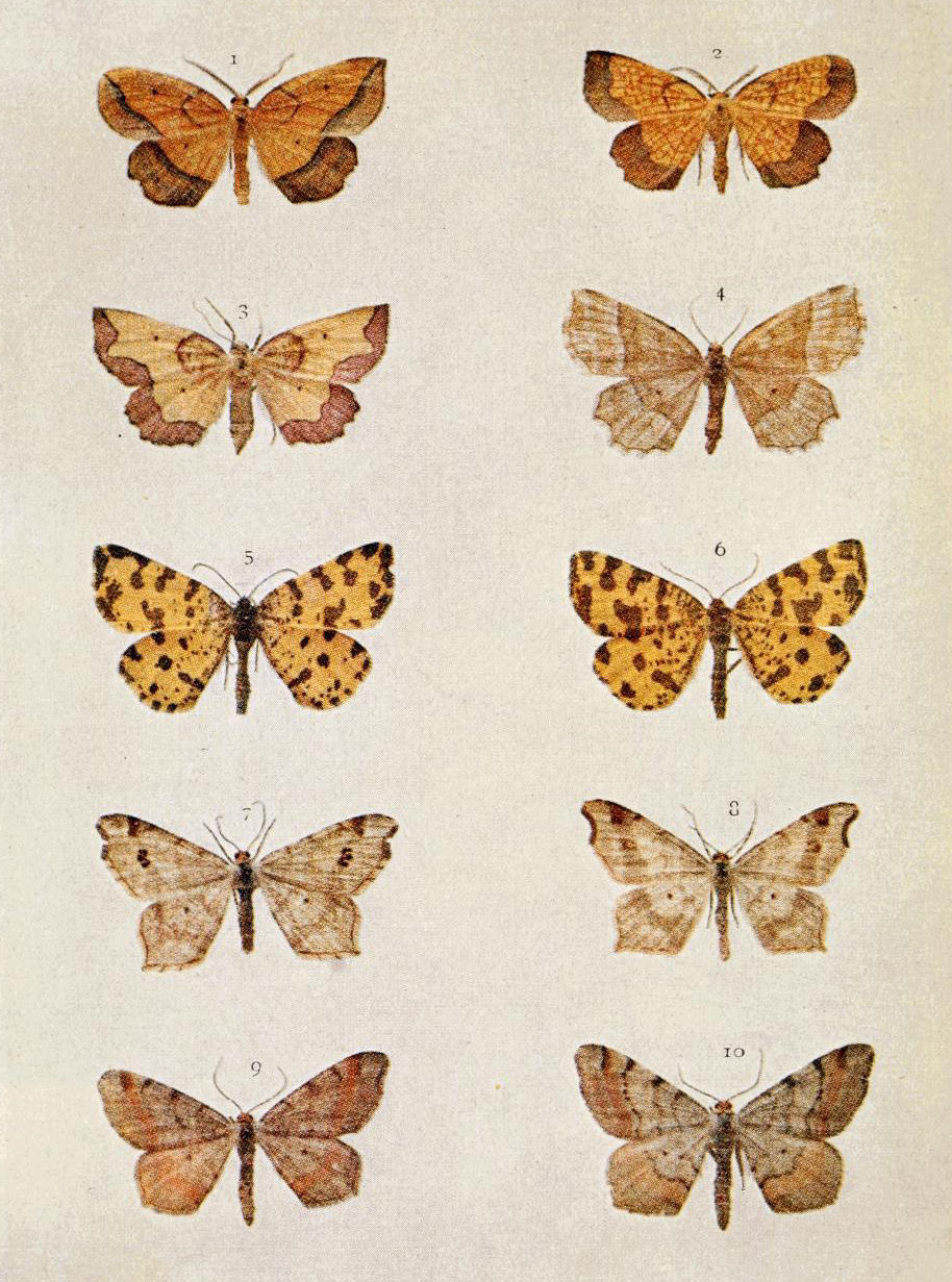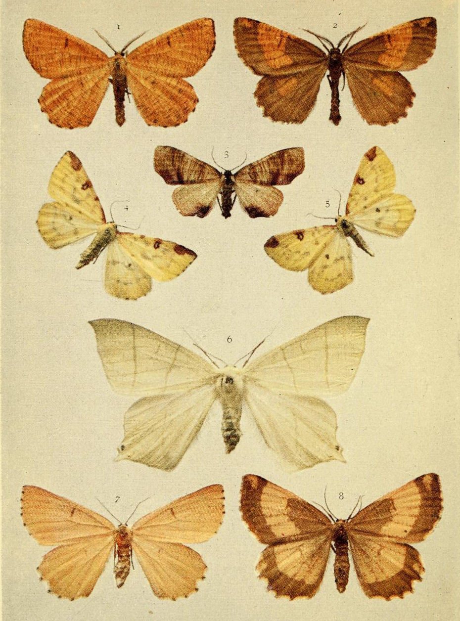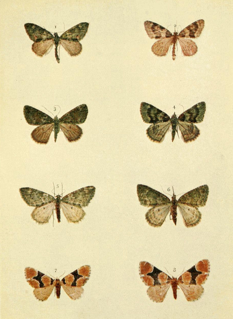 On Plate 9 is shown a male specimen of the typical form (Fig. 1). In ab. ochrea, Tutt, the general colour of the fore wings is ochreous with a greenish tinge, and so it differs from the type, in which the ground colour is reddish. In another ochreous form the cross bands are of a purplish tint (ab. punica, Borkhausen), and in ab. rufina, Hübner, the bands are also purplish, but the ground colour is of a somewhat brighter red than in the type. Ab. unicolor, Tutt, is dull reddish with indistinct cross markings, and seems to be a modification of the almost unicolorous form of a bright red colour, ab. rufa, Tutt. (Fig. 2.)
