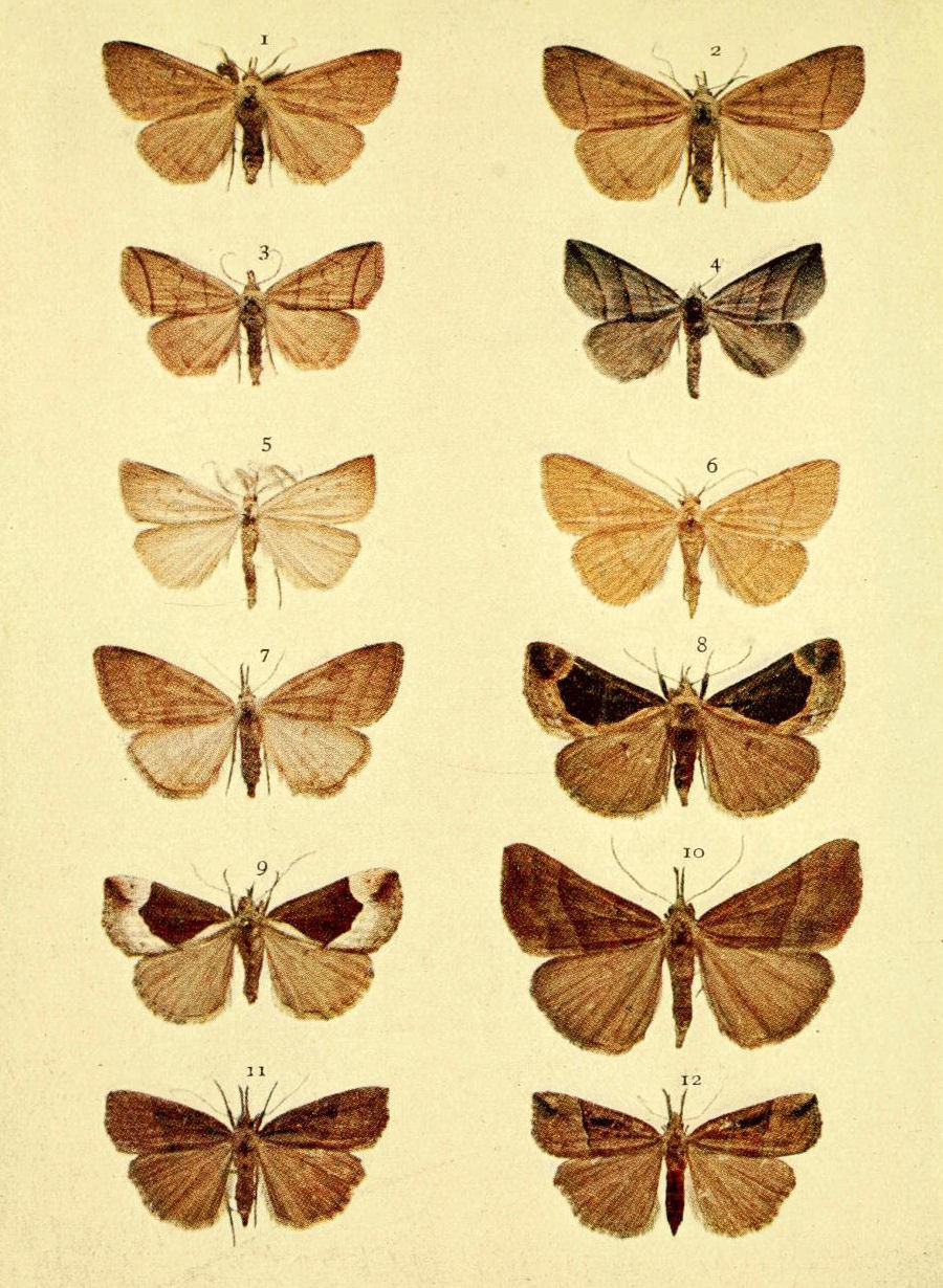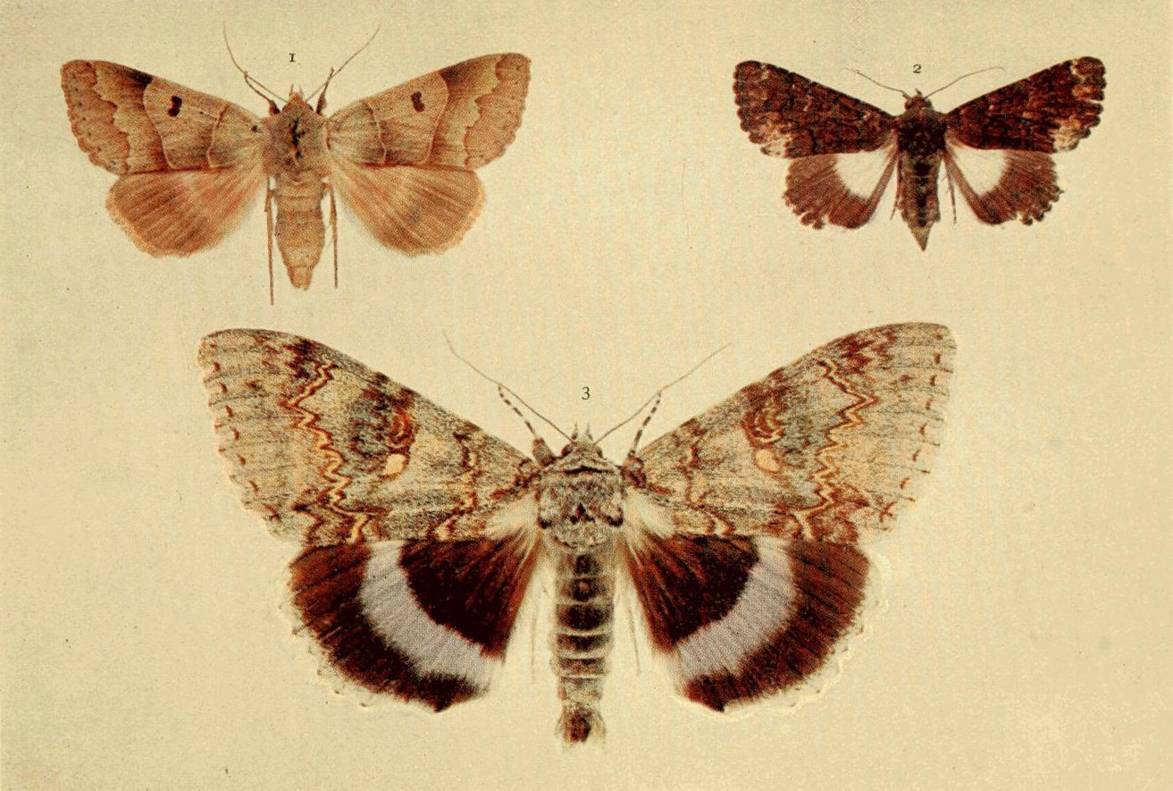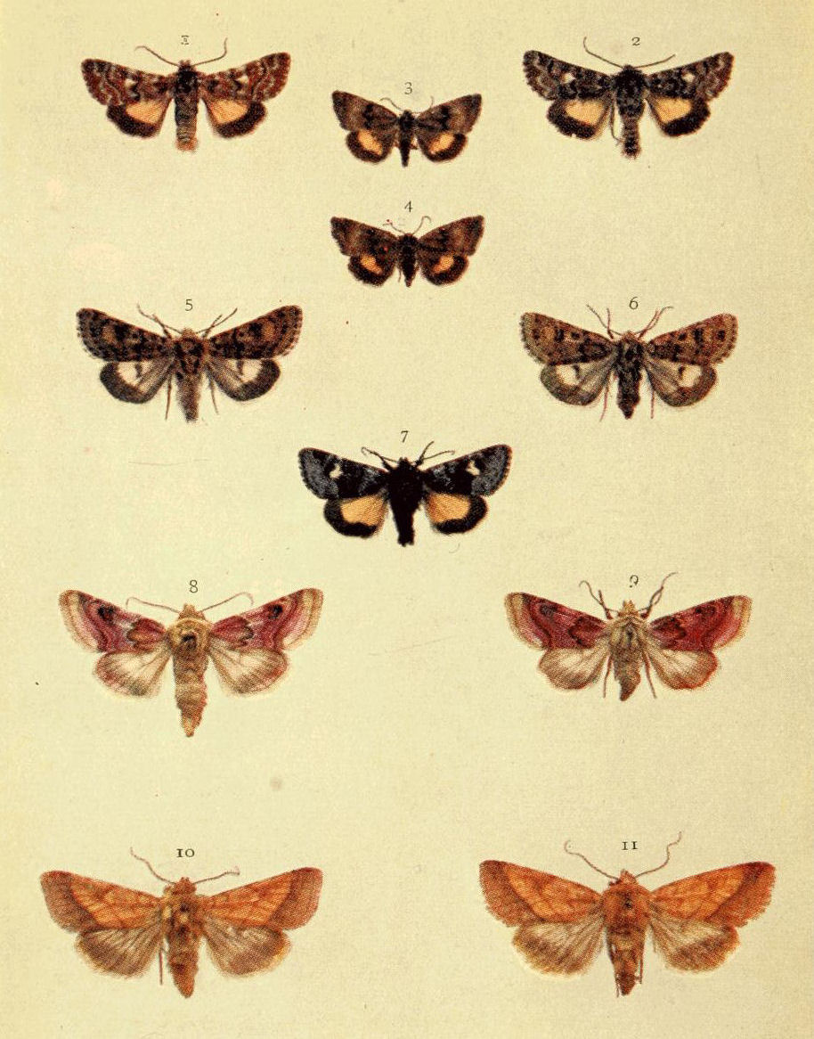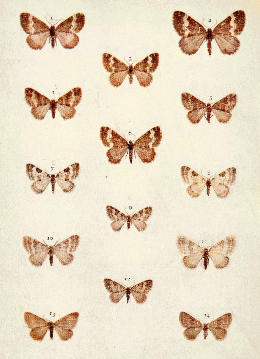 On Plate 9 is shown a male specimen of the typical form (Fig. 1). In ab. ochrea, Tutt, the general colour of the fore wings is ochreous with a greenish tinge, and so it differs from the type, in which the ground colour is reddish. In another ochreous form the cross bands are of a purplish tint (ab. punica, Borkhausen), and in ab. rufina, Hübner, the bands are also purplish, but the ground colour is of a somewhat brighter red than in the type. Ab. unicolor, Tutt, is dull reddish with indistinct cross markings, and seems to be a modification of the almost unicolorous form of a bright red colour, ab. rufa, Tutt. (Fig. 2.)