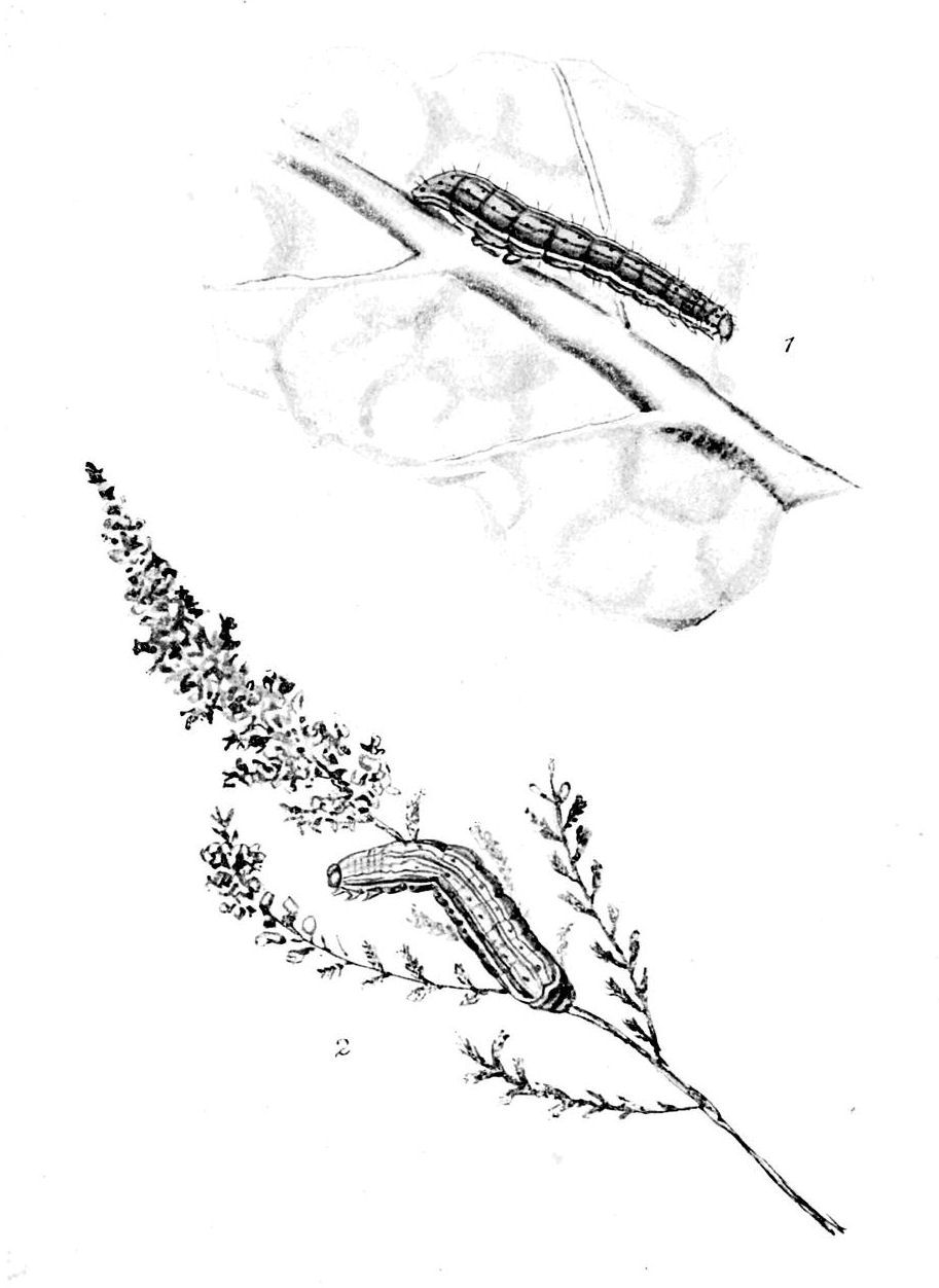 The caterpillar is reddish brown with white dots, and three white lines on the back; the line along the spiracles is whitish {14}with a dusky edge above. Head, ochreous brown; plate on first ring blackish lined with white. It feeds on beech, oak, and heather. When approaching full growth it probably feeds on low-growing plants, and it may be found from April to June.