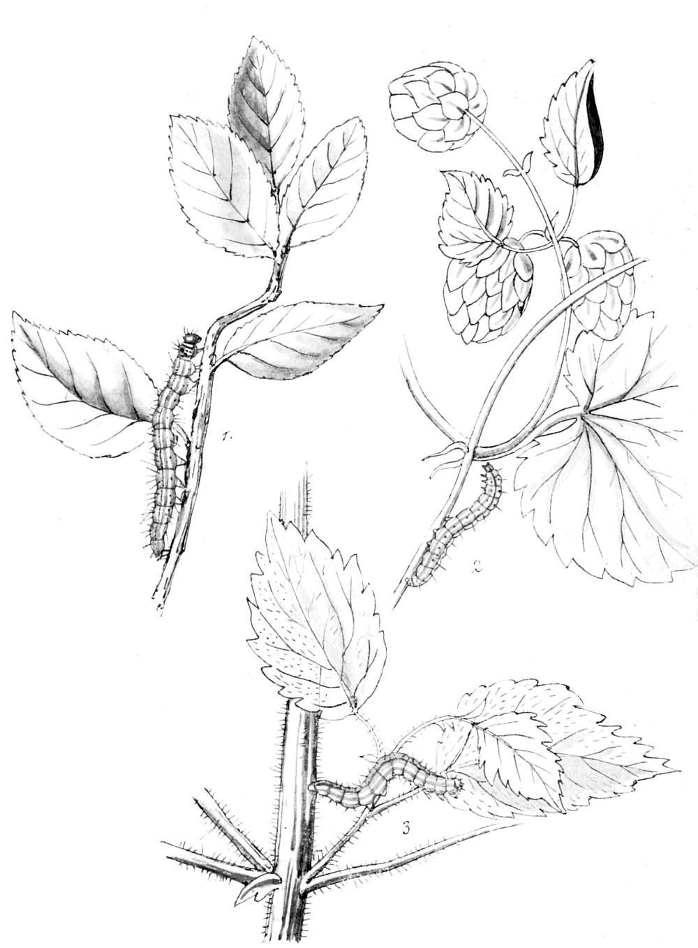 The caterpillar is green, sometimes tinged with olive and freckled with darker green; there are three dark-edged pale-green lines along the back; the under surface is tinged with yellowish, and is separated from the green colour of the upper surface by a whitish stripe, edged above with black; head, brownish, with darker freckles. It occurs in April and May, when it feeds on bramble, rose, oak, sallow, and some low-growing plants.