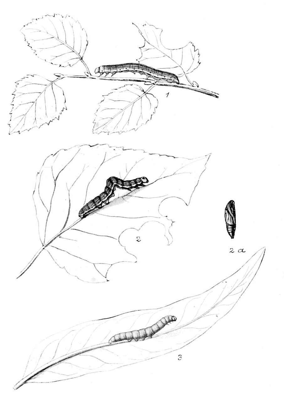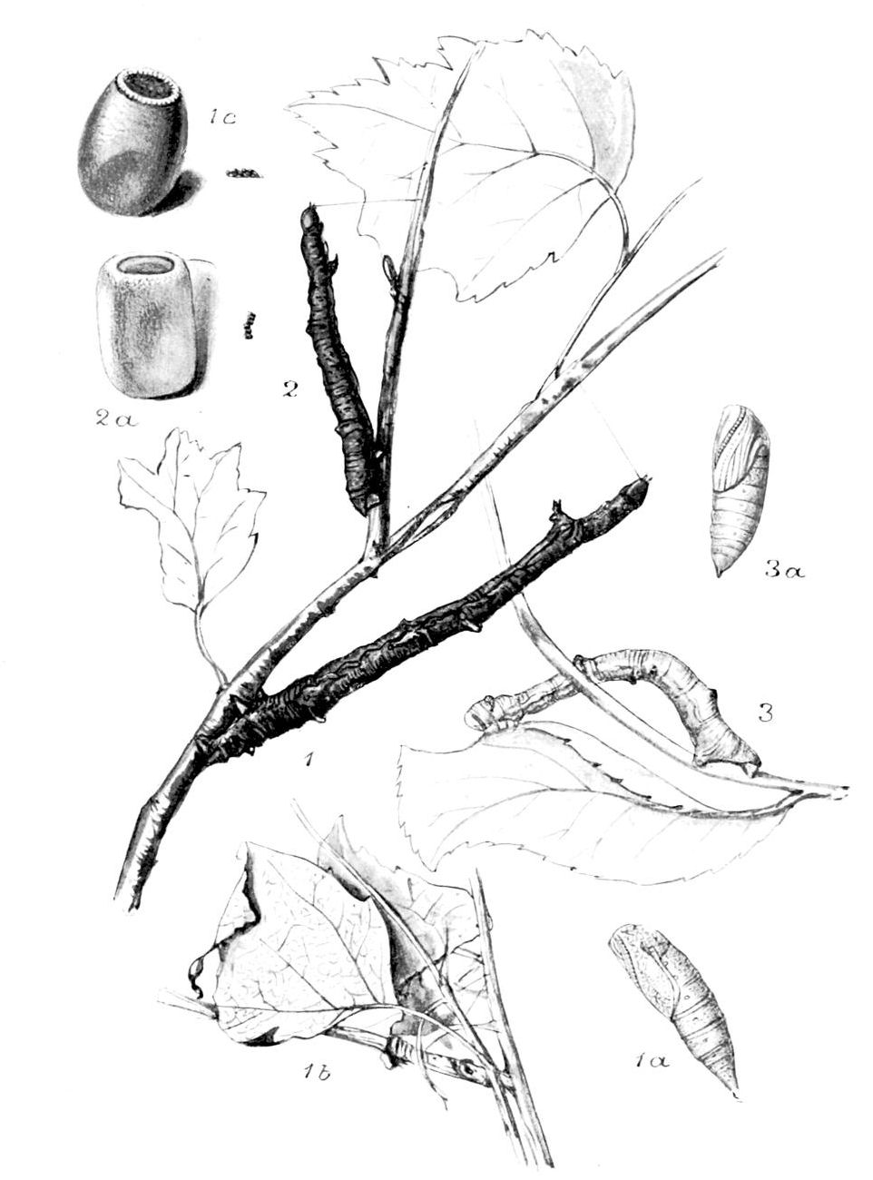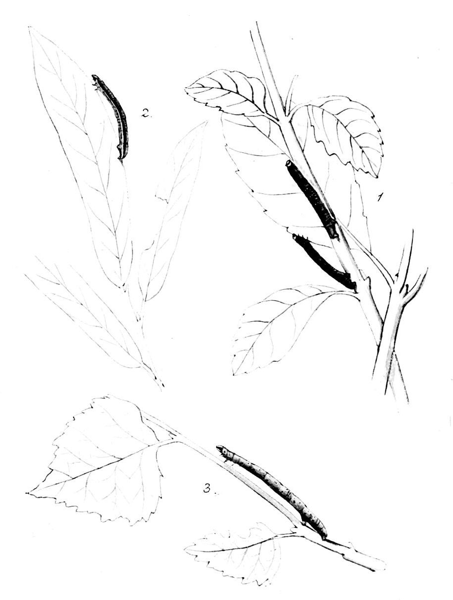 The caterpillar is pale dingy green, dusted with whitish, and yellow between the rings; three white lines along the back, and a double white line along the region of the purplish-edged white spiracles; head, pale yellow, the jaws black, and a small red {6}spot on each side above them. (Adapted from Porritt.) It feeds, from April to June, on the foliage of birch and aspen, and may be found in the daytime between the lower leaves.