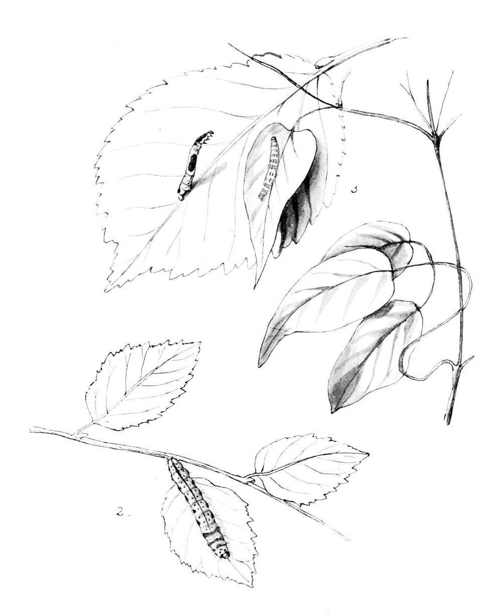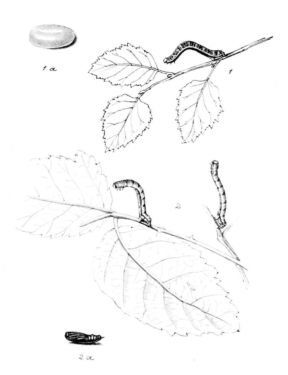 The caterpillar, which feeds on elm from April to June, is of a pale green, inclining to whitish green above, the raised dots white; there are three white lines on the back, the central one broader and clearer white than the others; the lines along the area of the black spiracles are whitish; head green and glossy, legs black, pro-legs greenish marked with reddish. It feeds at night, and conceals itself between leaves during the day.