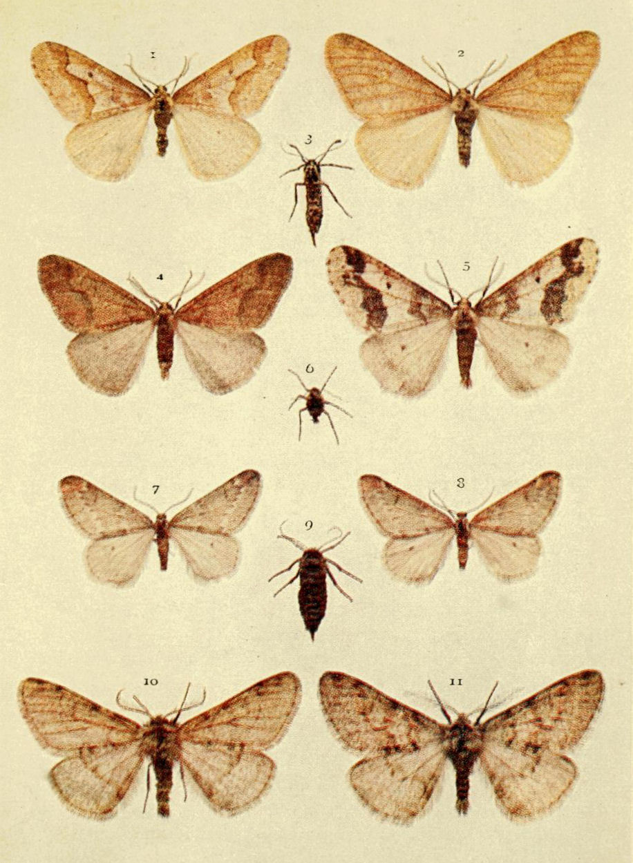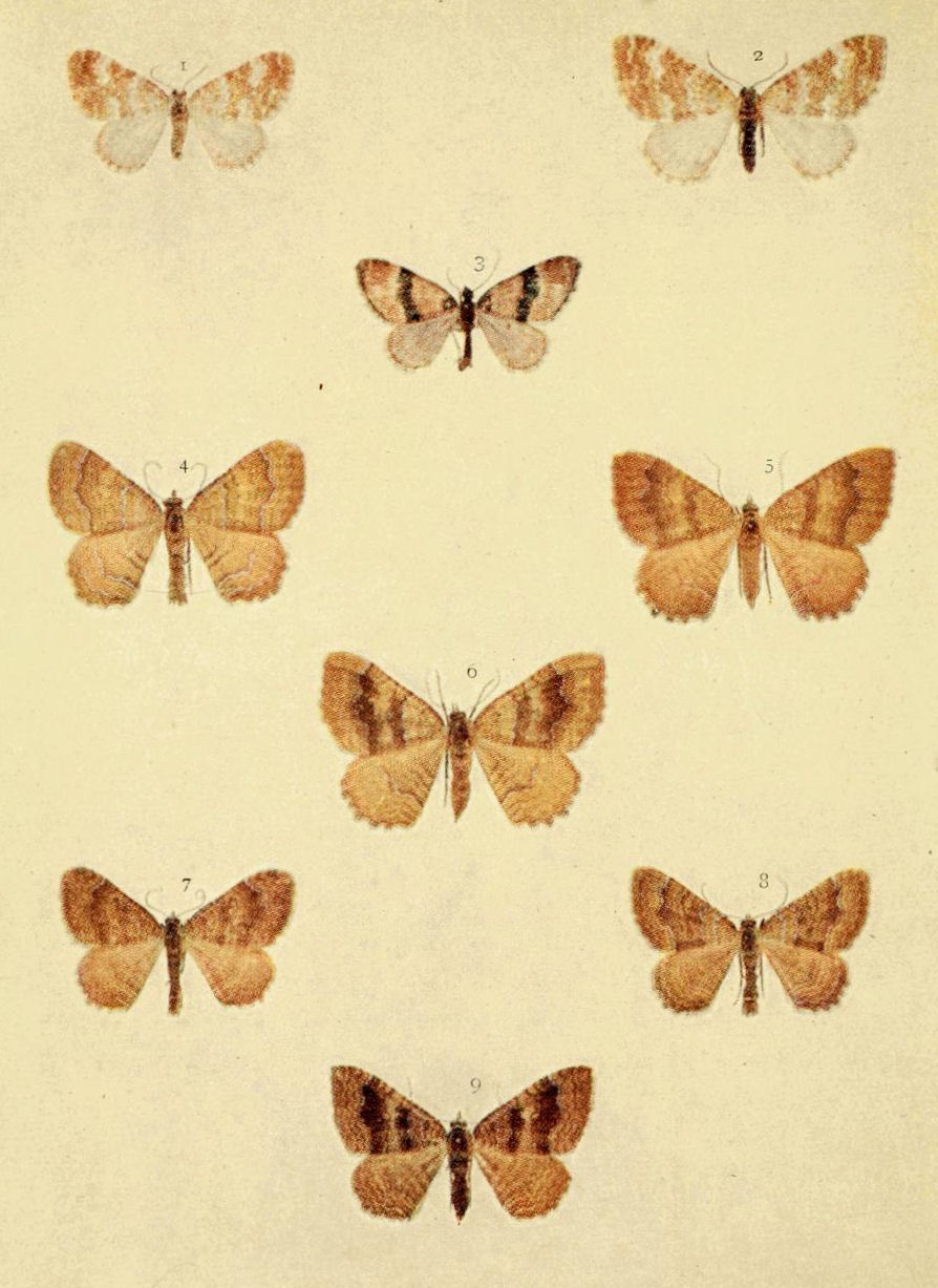 On Plate 9 are shown specimens from Scotland (Figs. 8 ♂, 9 ♀). The male, which has the basal area of the fore wings pale, is referable to ab. borealis, Sparre-Schneider, whilst the female is more nearly typical. In England the majority of the {17}specimens belong to ab. rufa, Tutt, which is reddish in the coloration of fore wing (Fig. 7). Sometimes the basal area in this colour form is pale also.