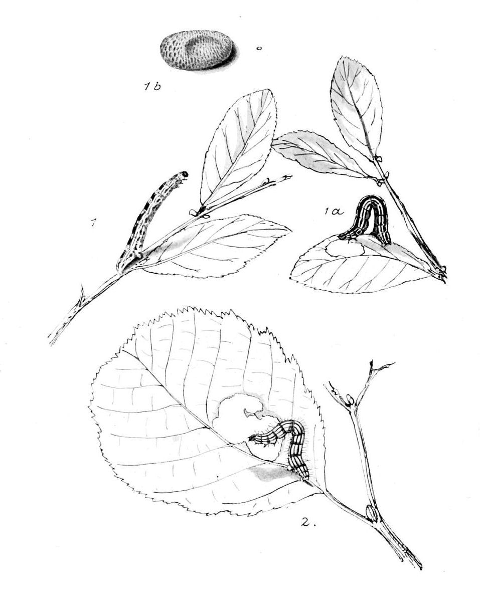 The caterpillar is green, with whitish warts emitting fine hairs, and has three lines along the back, the central one white and stripe-like; a yellow stripe low down along the sides is edged above with black. It feeds in April and May on elm, oak, apple, plum, etc., among the leaves of which it hides by day, and may be dislodged therefrom by jarring the boughs. (Plate 3, Fig. 2, after Hofmann.)