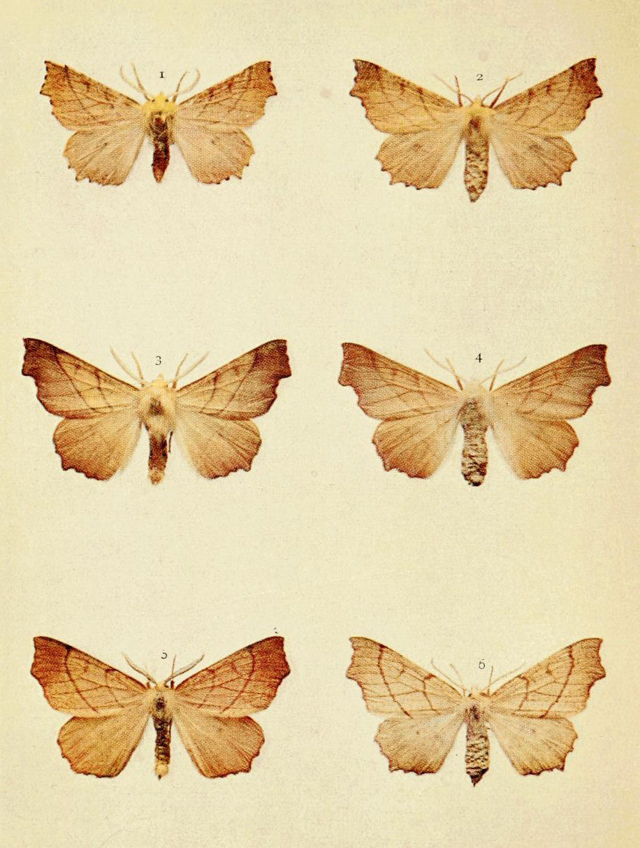 On Plate 2 will be found portraits of four specimens of this variable species. Figs. 8 and 9 represent a male and a female of the more ordinary forms. Specimens of the typical whitish or greyish buff colour vary in the matter of cross lines, which are well defined in the type, but absent in ab. pallida, Tutt. Some examples have a reddish central band, and in others the band is blackish or black; the latter are referable to ab. badiofasciata, {5}Teich. Ab. ochrea, Tutt, is of a reddish-tinged ochreous colour with clearly defined cross lines; and ab. rufa, Tutt, is red with distinct cross lines. Perhaps the rarest form of all is ab. nigra, Tutt, which in ground colour is deep blackish grey, with the cross lines faint.