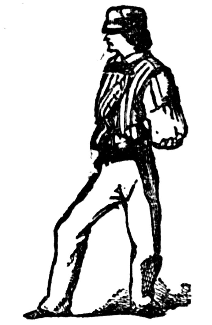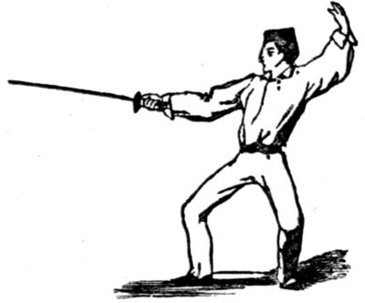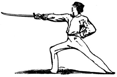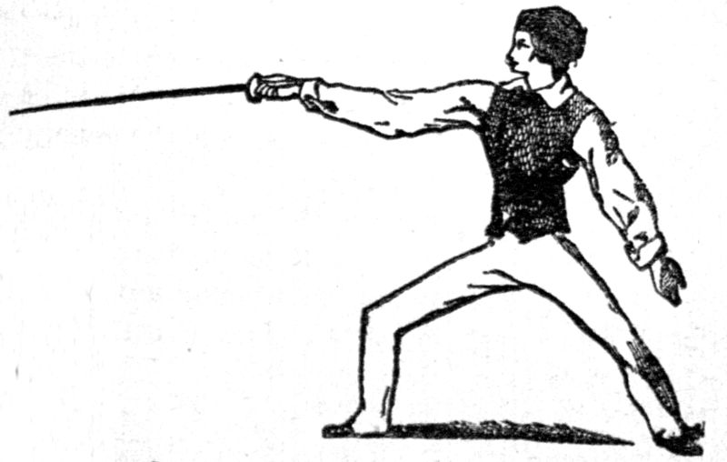 is a very important movement, and is rather difficult to make properly, and fatiguing to practice. Indeed, the first movements in fencing are the most trying to the learner; and he must not be discouraged if he fails to do them correctly at first—practice only will give him this power. The Longe is that extension of body which accompanies every attack, and is thus made:—The right[Pg 9] arm is extended straight from the shoulder, the arm and blade being on the same level; by a second movement, the right foot is raised from the ground, and a step made forward, about eighteen inches in length, while the left remains firmly planted in its place. At the instant that this step is made, the left hand is allowed to fall within a few inches of the left thigh, and the left knee is stiffened back until the leg is perfectly straight.