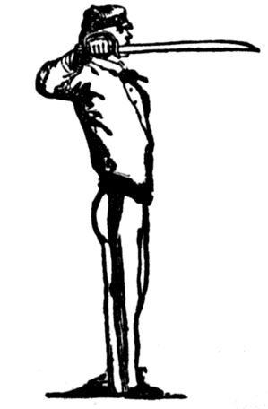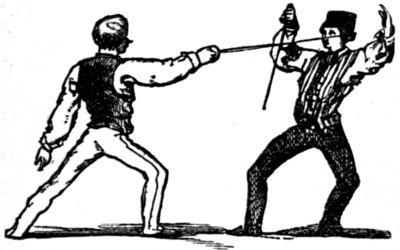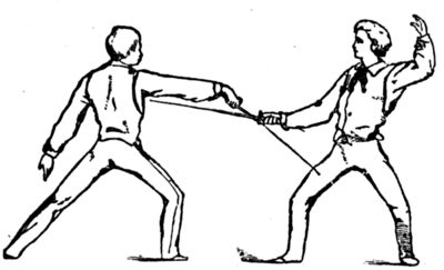 There is another method of parade called quarte over the arm—which is executed by making about[Pg 14] the same parade as in Tierce, with this exception—first, the hand is retained in its original position, with the nails upwards, and secondly, the point is not raised over the eye of the adversary.