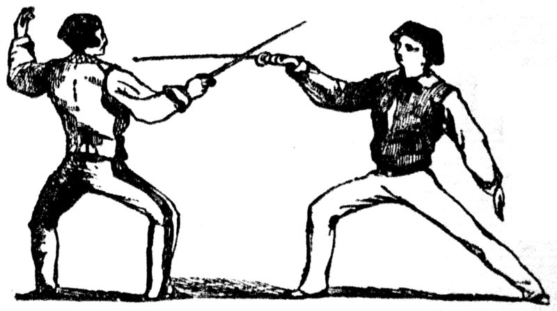 Fencing is the art of using the small-sword, or rapier. The small-sword has a straight blade, about thirty-two inches in length outside the guard, and is fashioned for thrusting only. Although it is an art of the greatest antiquity, very great improvements have been made in it during the last half-century, chiefly by French masters, who excel those of all other countries. This has been attributed to various causes; by some to the agility and acknowledged power of rapid physical action possessed by this nation; by others, to their natural[Pg 4] vivacity and mental quickness. In my opinion, however, a more direct and powerful cause may be traced in the great encouragement and universal patronage which it has ever received from every grade of a chivalrous and military people. Every regiment has its maitre d'armes, and every barrack its fencing-school. Indeed, in so important a light was the proper teaching of this art held, that one of the French kings (Louis XIV.) granted letters-patent to twenty eminent masters, who alone were permitted to teach in Paris. When a vacancy occurred, no interest and no favor could enable a candidate to obtain this privilege: he had to fence in public with six of these chosen masters, and if by any of them he was beaten by two distinct hits, he was considered unqualified to teach in the capital.