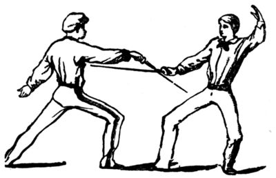It is customary for adversaries, on coming to[Pg 10] the Guard, to Engage, or to join blades, on what is called the inside, that is, the right side; although there are occasions on which it is advisable to engage on the outside, or on the left; otherwise called the Quarte or Tierce sides.