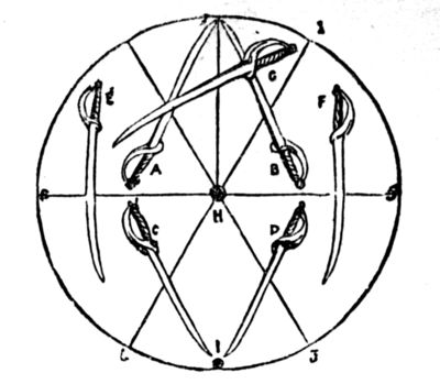 is formed by turning the hand in the same position in which it was turned for tierce, but the point of the foil slopes as much downwards as in tierce it did upwards; the direction and distance for the hand to traverse being the same. Again, had the attack been delivered at none of these, but at the inside under the hand, then the proper parade would have been