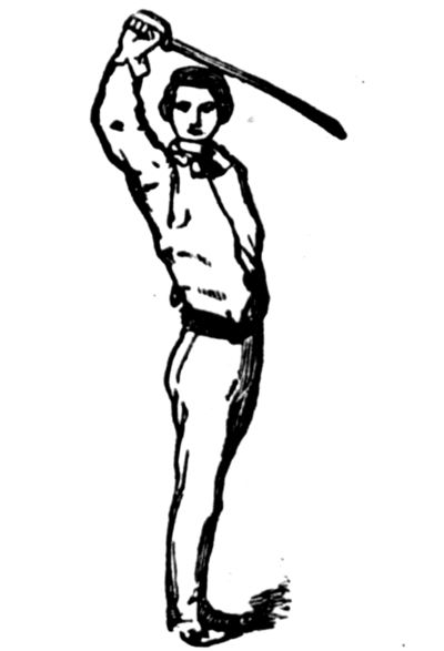 It is from this position that all movements are made, whether offensive or defensive. Let the beginner be placed with his knees straight, his feet at right angles, heel to heel; the right foot, right side, and face directed to the master. The body must be held upright and firm, the arms hanging down by the side, but easily and without constraint, the left hand holding the foil a few inches beneath its guard. Next, let him bring the right hand across the body, and seize the foil-handle; by a second movement, bring the foil above the head, the hands separating as they ascend, until both arms be nearly extended upwards and outwards. Here pause. This may be called the first position of the Guard.