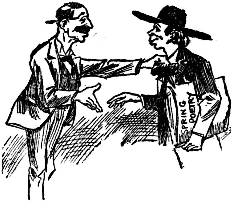 Talking about old days, when I was in budding manhood I thought I was in budding poethood as well. I wrote a little ballad for a grocery clerk, and[Pg 92] he was so effusive he made me blush. But the glad hand he gave me started me on the road to ruin. By some strange freak of fortune, I butted up against a real live versifier who had actually had his lines printed.