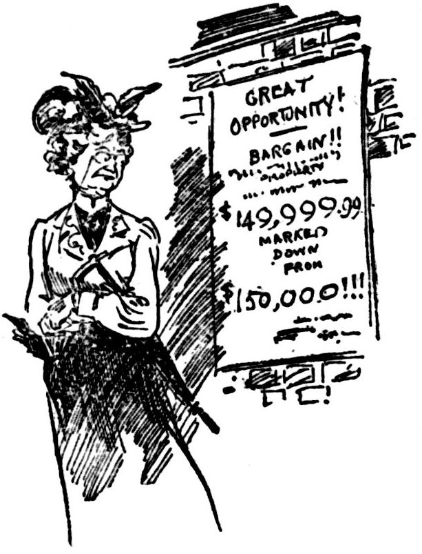 "George, dear, I have a little surprise for you. I have been going around among the girls who knew you before we were married and I have put down here the names of all those women you have kissed, and I'm going to ask you to give me a dollar for every kiss."