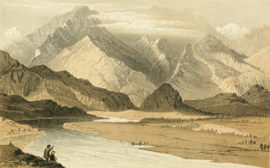 For the plates which accompany the work I have to thank Mr. Winterbottom, who very kindly permitted me to select from a series of sketches those which I thought most suitable. This was not an easy task; but in the two views of the neighbourhood of Iskardo I found so faithful a representation of the extremely rugged scenery of the Tibetan mountains, contrasted with the level plain of Iskardo, and the lacustrine strata of the neighbourhood, that no more desirable illustrations for a journey in Tibet could be conceived. The little vignette, too, though it does not represent any part of the country through which I travelled, is precisely similar to many ravines in Rondu, and serves to show that the Gilgit valley is quite the same in general appearance with that district. I was more particularly desirous of introducing this sketch, from the very faithful representation it contains of the alluvial platforms which skirt the streams in every part of Tibet.