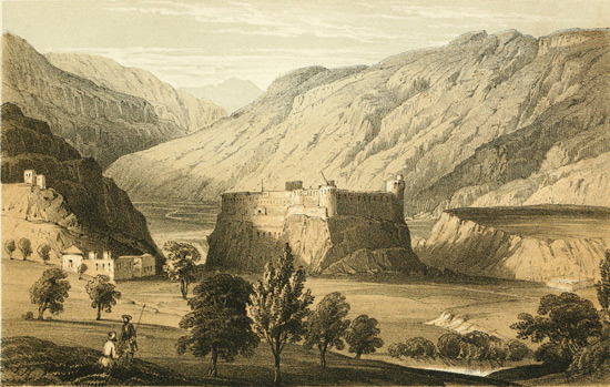 After reaching the stream just mentioned, which is crossed by a ford, a suspension bridge, for which the piers are partly built, having never been erected, the road continues to descend parallel to it towards the north, passing under the military station of Sabathu, which, at the elevation of 4200 feet, occupies the crest of the ridge immediately to the east of the little river, a very short distance before its junction with the Gambar.