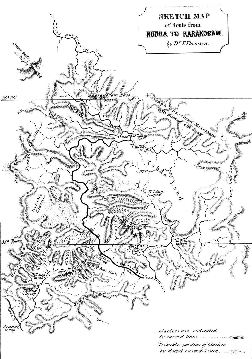 The sketch of the district between Nubra and the Karakoram pass, which will, I hope, be found useful as an illustration of that part of my journey, has been prepared for me by Dr. Hooker, from a rough draft of my survey, assisted by verbal explanations.