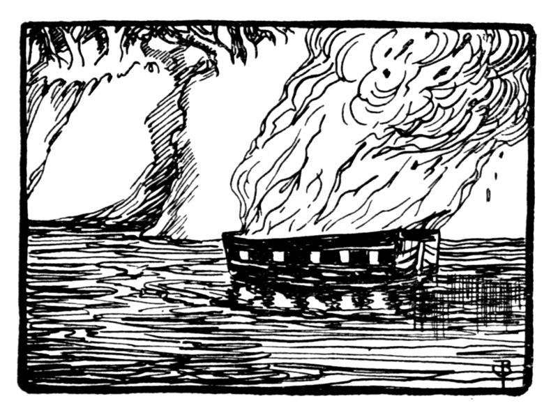 The “Theodore” was launched to the north of the Two Snags, but[Pg 18] she caught fire suddenly—really, we set fire to a lot of touchwood and stuff inside her because we wanted to see what a ship on fire would look like on the river.