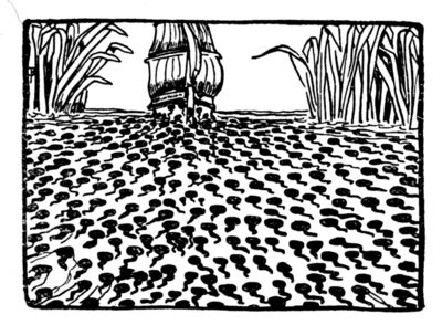 The skipper set all hands to work to rig up a tarpaulin to keep the water out; we really stuffed a big dock leaf in, and the “Theodore” continued her voyage right through a terribly dangerous passage at the western end of the Twisty Straits, opposite the Desolate Dead Man’s Teeth, and she passed The Narrows, the most dangerous place on the whole river, where there is only just room for one vessel to pass through at a time.