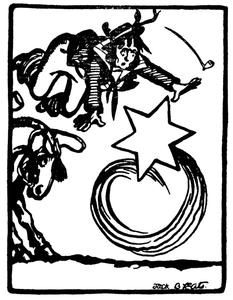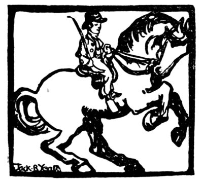 “Here, palpably, was a hint for somebody, who has turned out to be Mr. Jack B. Yeats. The first of his ‘plays in the old manner’—‘James Flaunty; or, The Terror of the Western Seas’—lies before me, and it is a study in grotesque. The most notable point in this production is the fact that the interest thereof attaches not only to the dialogue—you will, however, relish that—but to the setting, the close reproduction of old-world lettering and art, which is a vast deal more than an ordinary publisher’s advertisement, and cunning enough to deceive the very elect. The ferocious woodcuts, the jaunty humour of the speeches, the fore-and-aft and down-the-hatchway plot, the bizarre characters, harmonize perfectly, and well they may; for Mr. Yeats, all by himself, has invented those same characters, contrived the plot, fashioned the speeches, and designed the illustrations.